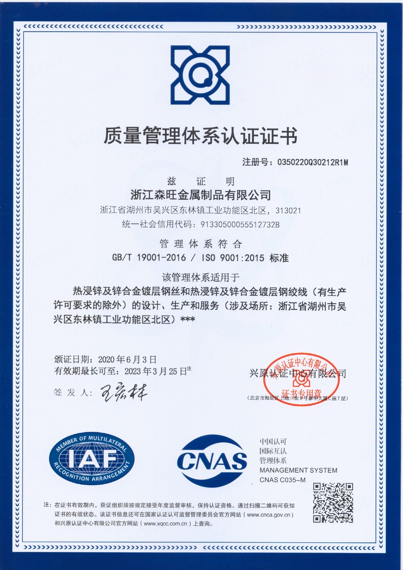 浙江森旺金屬制品有限公司成立于2012年,坐落湖州市吳興區(qū)東林鎮(zhèn)工業(yè)功能區(qū)。公司專業(yè)從事各類鍍鋅鋼絲、鋼絞線等產品的開發(fā)及生產。目前產品已廣泛應用于各類通信光電纜,電力輸送,電氣化鐵路工程,各類堤壩防護及農業(yè)溫室等工程領域。公司秉承“追求卓越品質,創(chuàng)建卓著信譽”的經營理念,始終堅持專業(yè)化、規(guī)模化的經營模式。